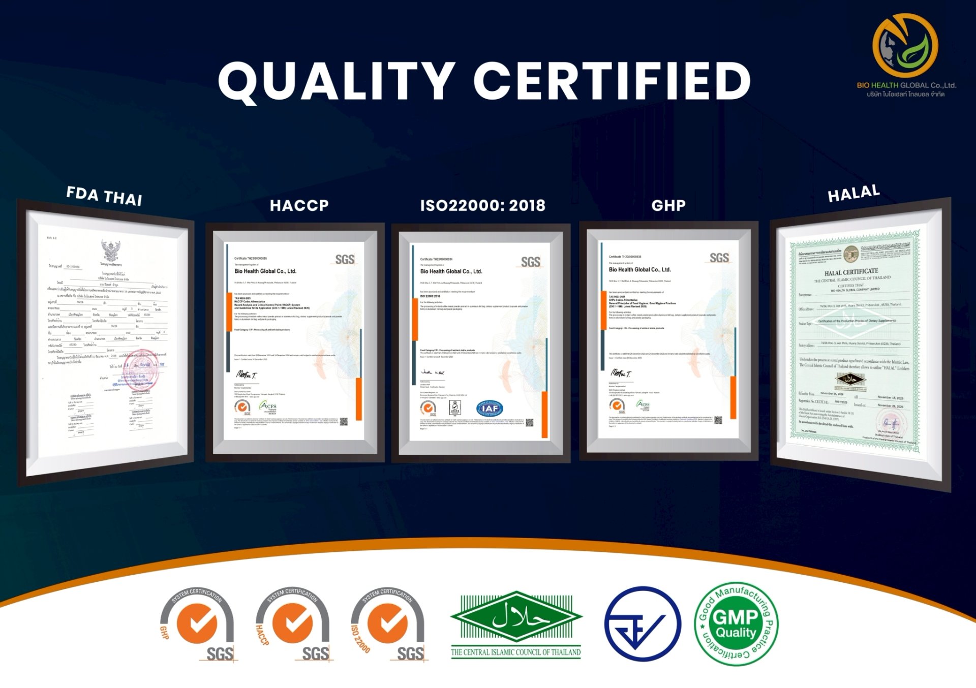 ด้วยการควบคุมคุณภาพอย่างละเอียด พร้อมมาตรฐานการผลิตระดับสากล ISO22000, GMP, HACCP, HALAL, FDA เราพร้อมเป็น “พาร์ทเนอร์ทางธุรกิจ” ที่ช่วยส่งเสริมความสำเร็จให้กับแบรนด์ของคุณได้อย่างยั่งยืน
